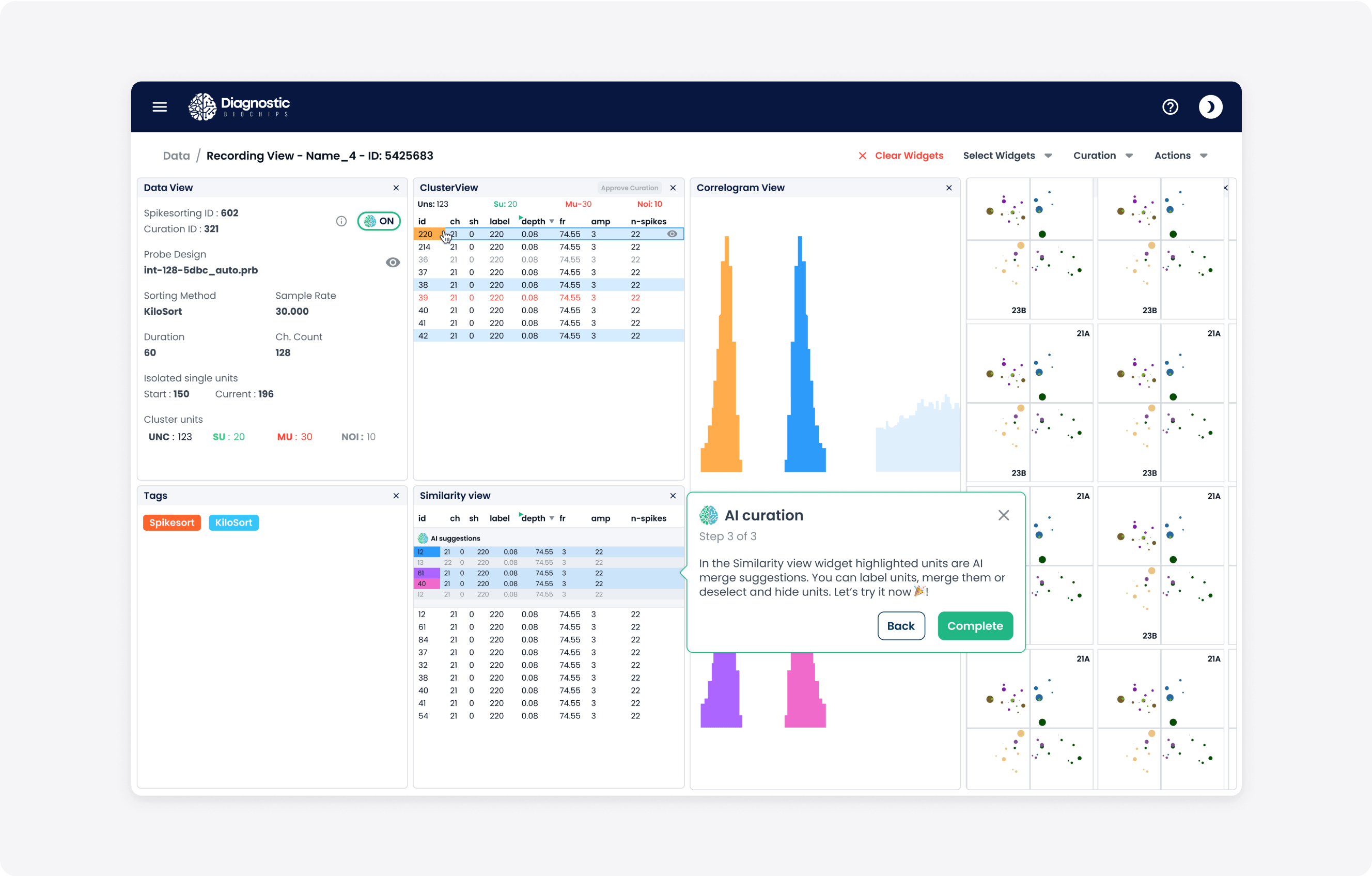 To simplify manual curation for neuroscientists, we created a user-friendly UI/UX design. It features a customizable grid and an extensive set of functional widgets. Our work also included implementing AI-powered curation, which provides an already-curated output. Scientists can then analyze and edit the output as needed. This method streamlines the data refinement process, leading to more research insights.