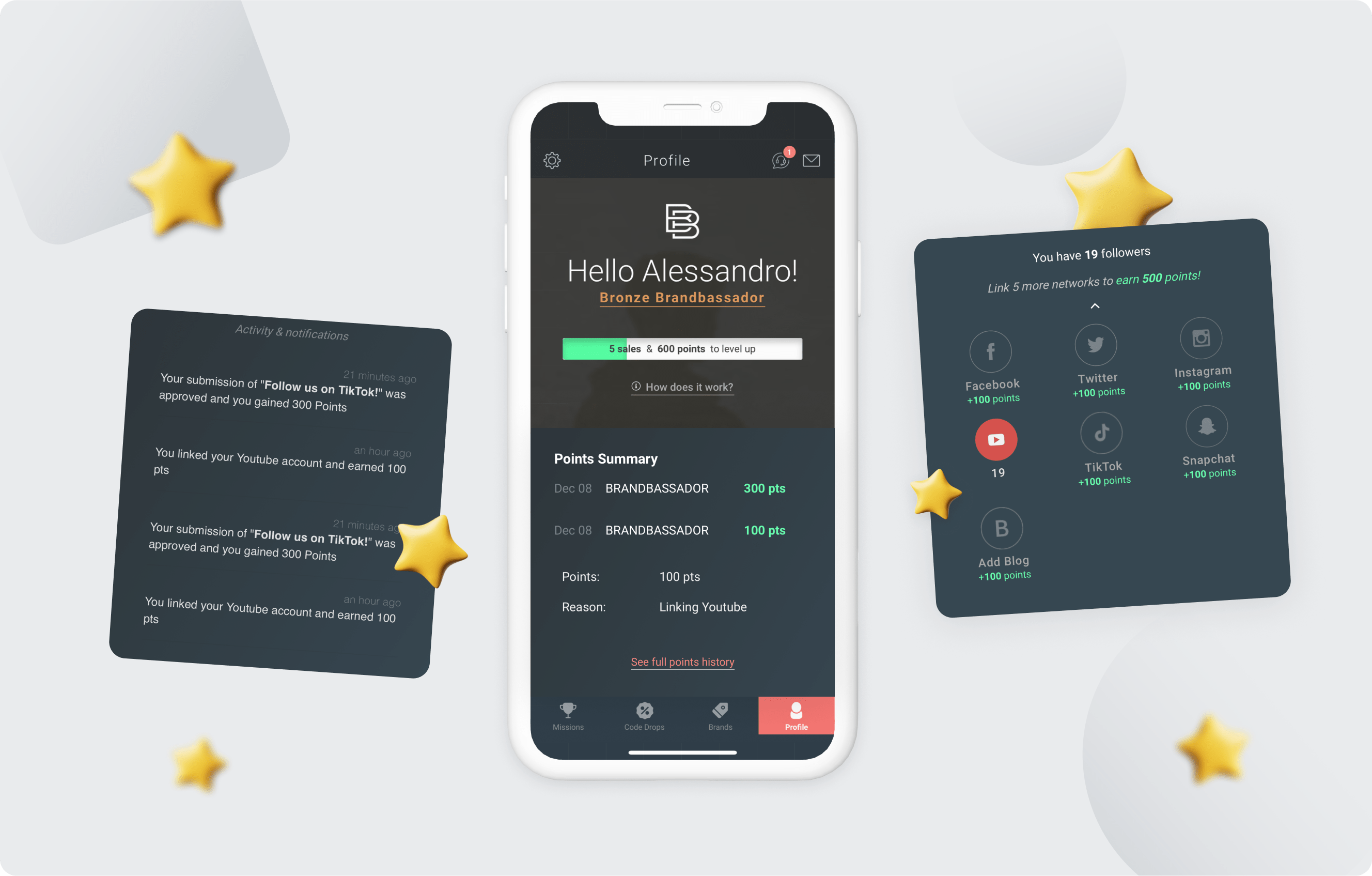 Brandbassador 采用积分奖励制度。当 "影响者 "更频繁地创建内容和推广品牌时,他们就能获得更多积分。累积积分可让影响者获得各种奖励。