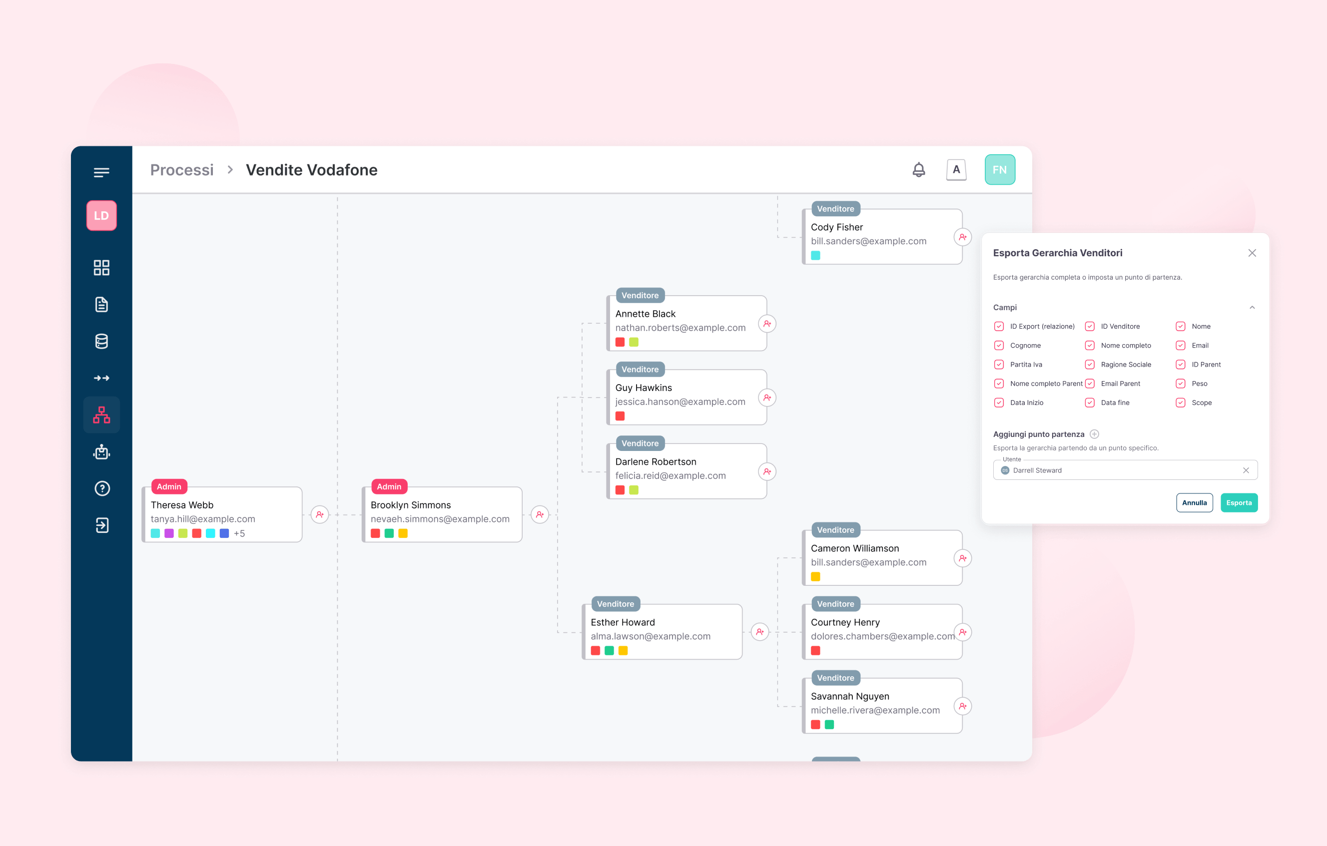 在 Coraly 中,我们简化了供应商层次结构的构建。它提供了组织结构和角色的可视化表示。这种层次结构将销售商与特定流程联系起来,增强了协作性和透明度。Coraly 使用户能够创建动态的供应商层次结构,以反映其组织的复杂性。