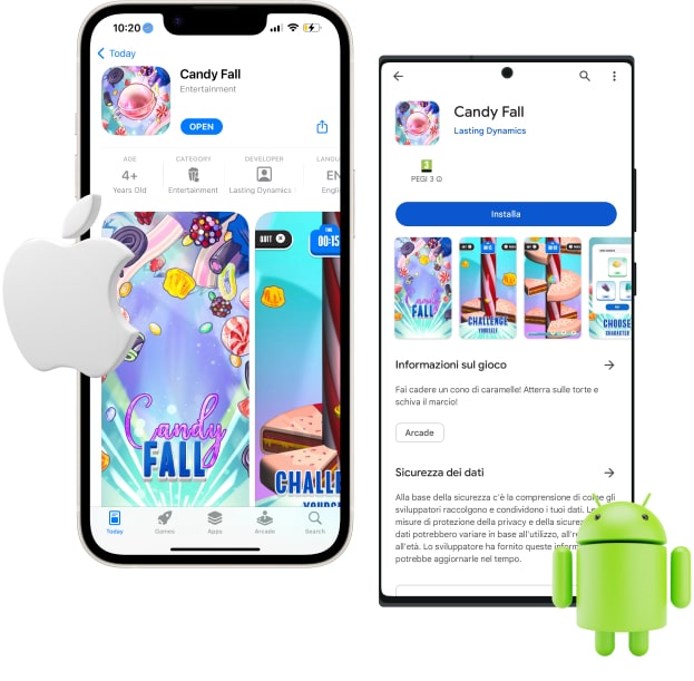 我们对玩家参与度的了解使我们能够将《糖果坠落》打造成一款同时吸引儿童和成年人的令人上瘾的游戏。在这款街机游戏中,选定的糖果从糖果手杖上滑下,收集金币,选择能提高技能的点心,躲避致命的烂蛋糕--所有这一切都要与时间赛跑。