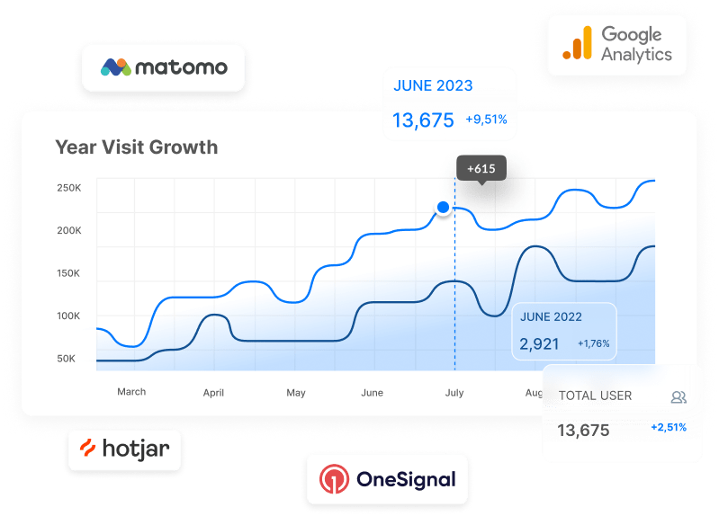 利用我们在集成最佳第三方工具方面的专业知识,启动您的数据分析之旅。我们将为您的平台配备功能强大的分析工具,以满足您的独特需求,从一开始就实现对用户数据的有效跟踪和分析。